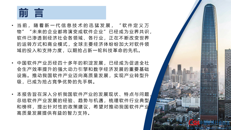 为推动我国软件产业高质量发展,科学评价软件产业的发展成果成效,中国软件行业协会基于多年累计的行业数据分析总结和企业调研,编制了《中国软件产业高质量发展报告(2024)》。该报告旨在科学、客观地反映我国软件产业的发展现状及趋势特点,希望能够为软件产业的高质量发展提供智力助益。