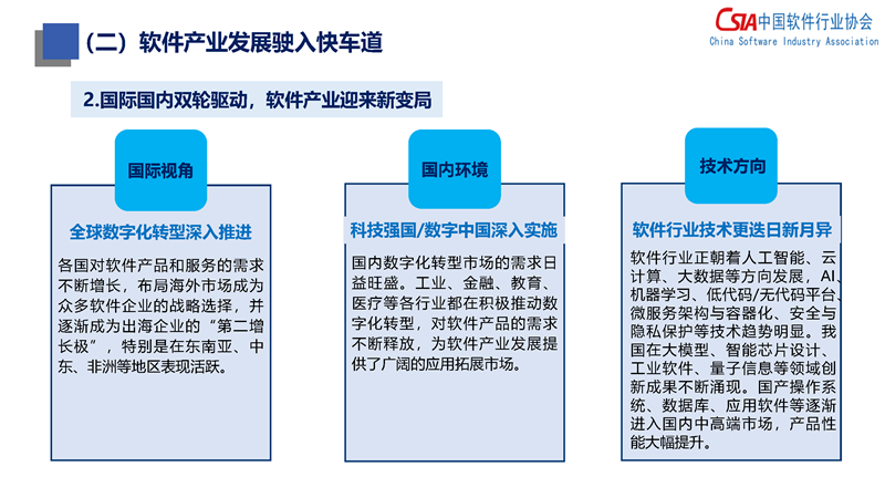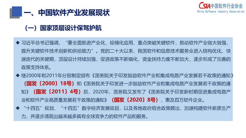 软件是新一代信息技术的灵魂,是数字经济发展的基础,是制造强国、网络强国、数字中国建设的关键支撑。习近平总书记强调,“要全面推进产业化、规模化应用,重点突破关键软件,推动软件产业做大做强,提升关键软件技术创新和供给能力”。党的二十大以来,我国软件和信息技术服务业进入结构优化、快速迭代的关键期,顶层设计持续加强,为软件产业的持续健康发展创造了有利基础条件。