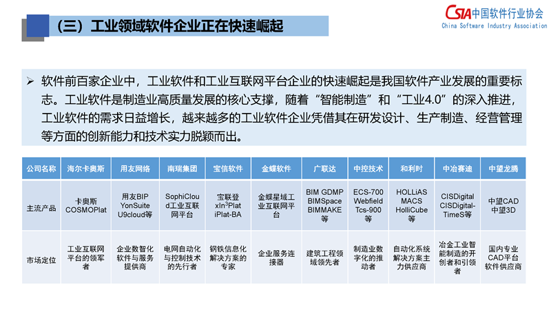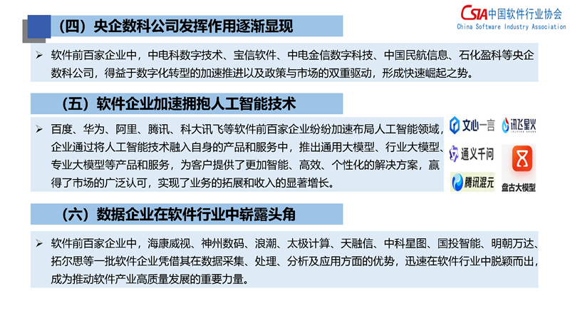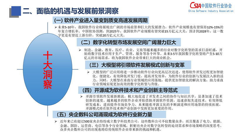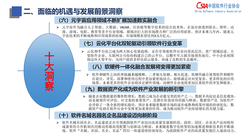 《报告》总结了软件领域十大趋势洞察:软件产业进入量变到质变高速发展周期,数字化转型市场发展空间广阔潜力巨大,大模型将引领软件发展模式创新与变革,开源成为软件技术和产业创新主导范式,央企数科公司涌现成为软件行业新力量,元宇宙应用领域不断扩展加速数实融合,云化平台化双轮驱动引领软件行业变革,软硬件一体化融合发展将变得更加紧密,数据资产化成为软件产业发展的新引擎,软件名城名园名企名品建设迈向新阶段。