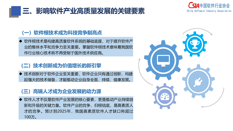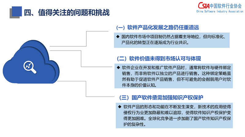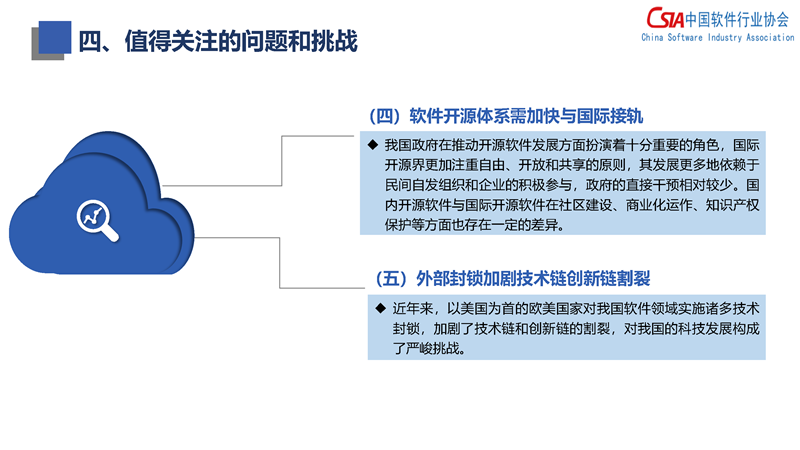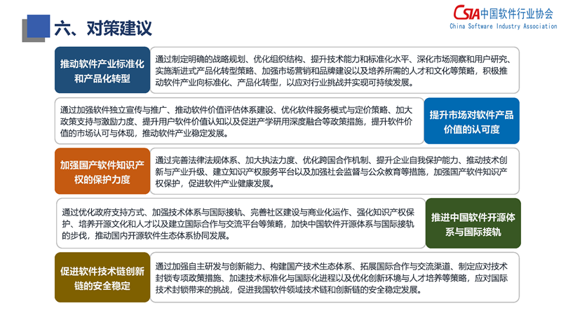 《报告》认为,软件根技术、技术创新、高端人才、数字经济、政策环境是影响软件产业高质量发展的关键要素,并提出了值得关注的五大问题与挑战:软件产品化发展之路仍任重道远,软件价值未得到市场认可与体现,国产软件亟需加强知识产权保护,软件开源体系需加快与国际接轨,外部封锁加剧技术链创新链割裂,并提出了相对应的对策建议。