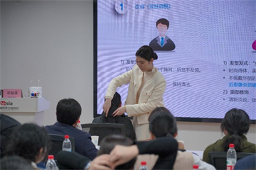 在“商务礼仪与高效沟通实战”课程当中,郑老师首先以“首因效应”数据直观阐明了职业形象的重要性——初次见面的前7秒至2分钟内,形象和举止的影响占比达68%。随后,她围绕职业形象、商务拜访、办公礼仪、客户接待、线上线下会议礼仪五大核心模块展开系统讲解。在职业形象实操环节,郑老师现场分发盘发工具与领带,手把手指导女士打造整洁干练的职业盘发,教授男士标准温莎结的打法,从发型、着装、配饰等细节入手,帮助参与者快速掌握商务场合的形象规范。